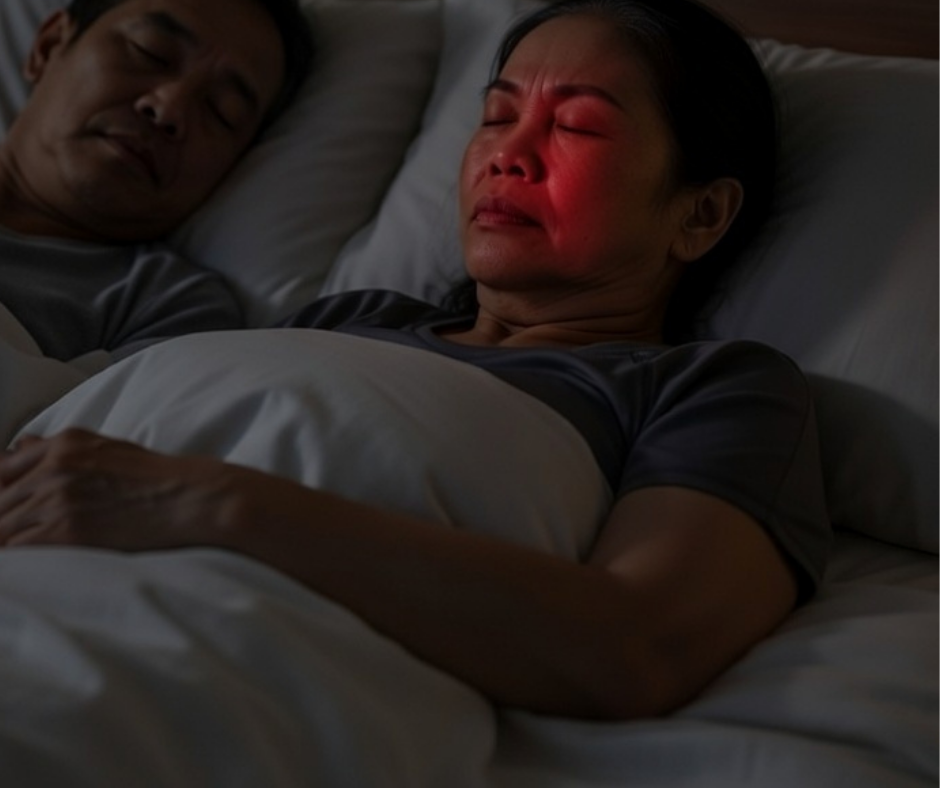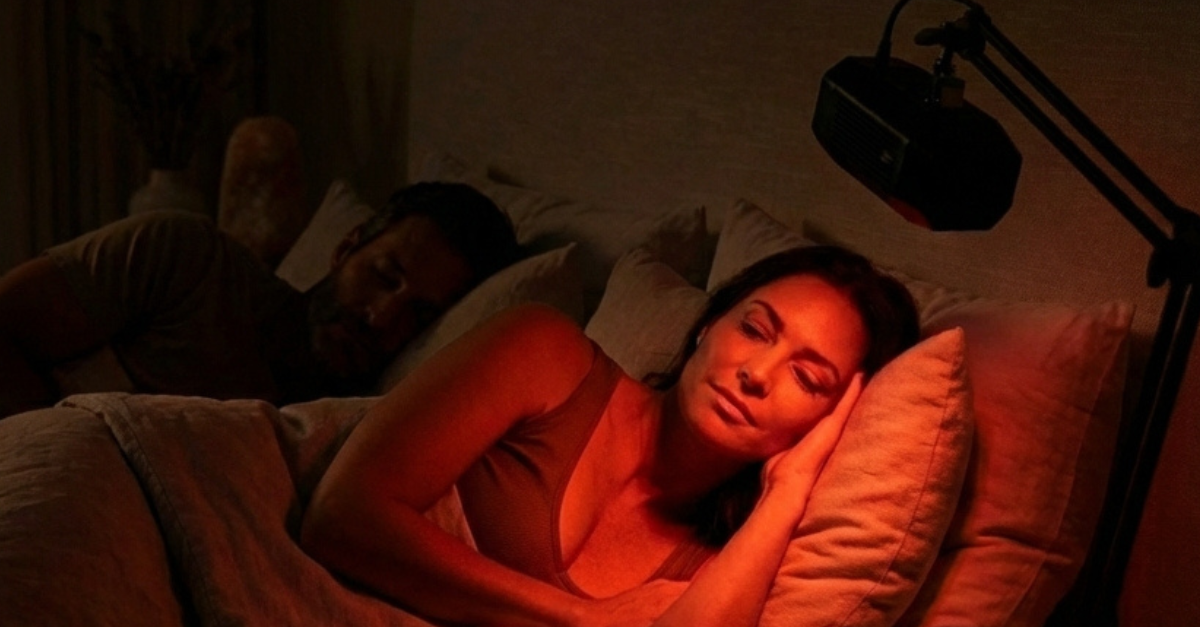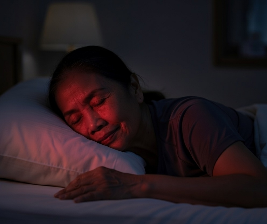 Night Mode turns the red light OFF so only near-infrared (NIR) runs. NIR is invisible, so the session is calm and discreet with no bright light.